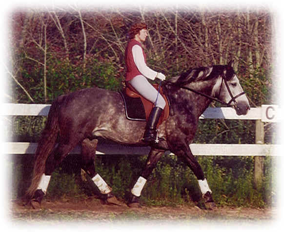 Petra's quest for the ideal horse led her to Hamid Hill Farm's Spanish-Norman stallion Soldado H.H.F., sired by the Andalusian Embajador IX. Allan Hamid recalls: "I remember the day Petra came to see Soldado. I knew immediately it would be a perfect match. Petra's enthusiasm for the breed is equal to her dedication to Soldado. There is an incredible bond between Petra and Sol. Linda and I are so glad she has shared her wonderful experiences with us all. Soldado H.H.F. was a favorite with the audience at the Equine Affaire in W. Springfield, Massachusetts in November 1998 when he participated in the Spanish-Norman breed demonstration. It has also been our pleasure to get to know Petra's daughter, Ruth Spiero, who moved from Madrid, Spain to Massachusetts where she is a horse trainer and instructor. We look forward to more happy times together with our Spanish-Normans."
